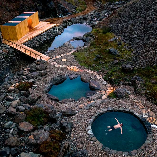 The hotel offers 48 luxurious rooms in four sizes and a fine dining restaurant. The hotel is surrounded by stunning nature, during winter guest can experience the Northern Lights and play golf during summer. There is also a geothermal pool open all year round for visitors of the hotel. Húsafell is a natural playground, located between a glacier and a lava field, where you can visit an ice-cave, lava-cave, go horseback riding, hiking or relax at geothermal bathing resort.